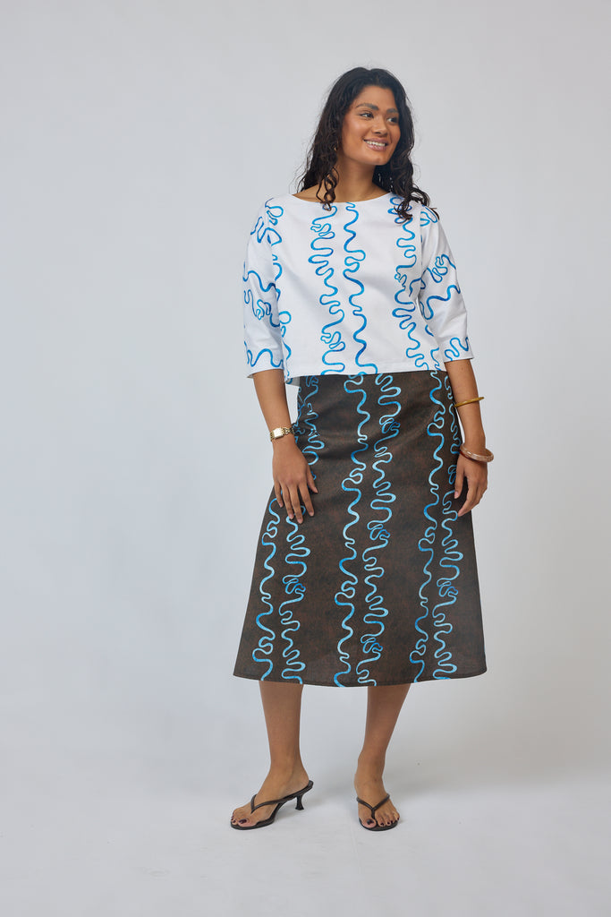 A versatile and elegant midi length A-line skirt, with a comfortable waist facing and back zip.
